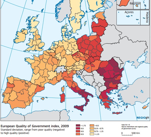 De calidad de Gobierno habla el estudio presentado ante la Comisión Europea se titula Regional Governance Matters: A Study on Regional Variation in Quality of Government within the EU. Propone un índice de la calidad del gobierno (llamado EQI) y han medido este índice en los gobiernos estatales y en los gobiernos regionales. Evalúa el nivel de corrupción política y social, la calidad del sistema sanitario, la calidad de la educación, varios índices de convivencia y respeto ciudadano, la igualdad ante la ley, etc. El índice indica la percepción de los ciudadanos ante distintos temas y para contarlo se han basado en 34.000 entrevistas en los 27 países de la Unión Europea y en una amplia documentación.