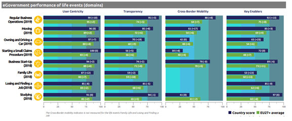 La Movilidad transfronteriza sigue siendo el indicador que obtiene la puntuación más baja. Si bien mejora con respecto a hace dos años en 7 puntos porcentuales,situándose en el 56% el conjunto de la UE. Mientras que a nivel global europeo el 87 % de los servicios están disponibles en línea para los usuarios nacionales, sólo el 69 % está disponible para los usuarios extranjeros, con enormes diferencias entre los Estados miembros.